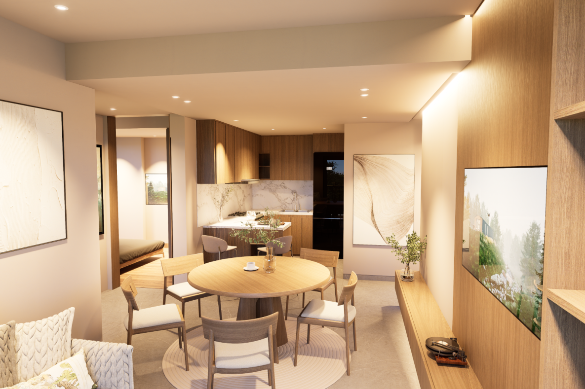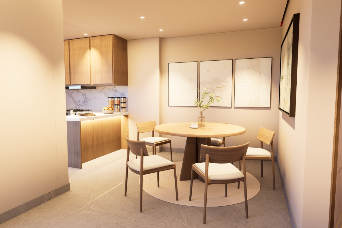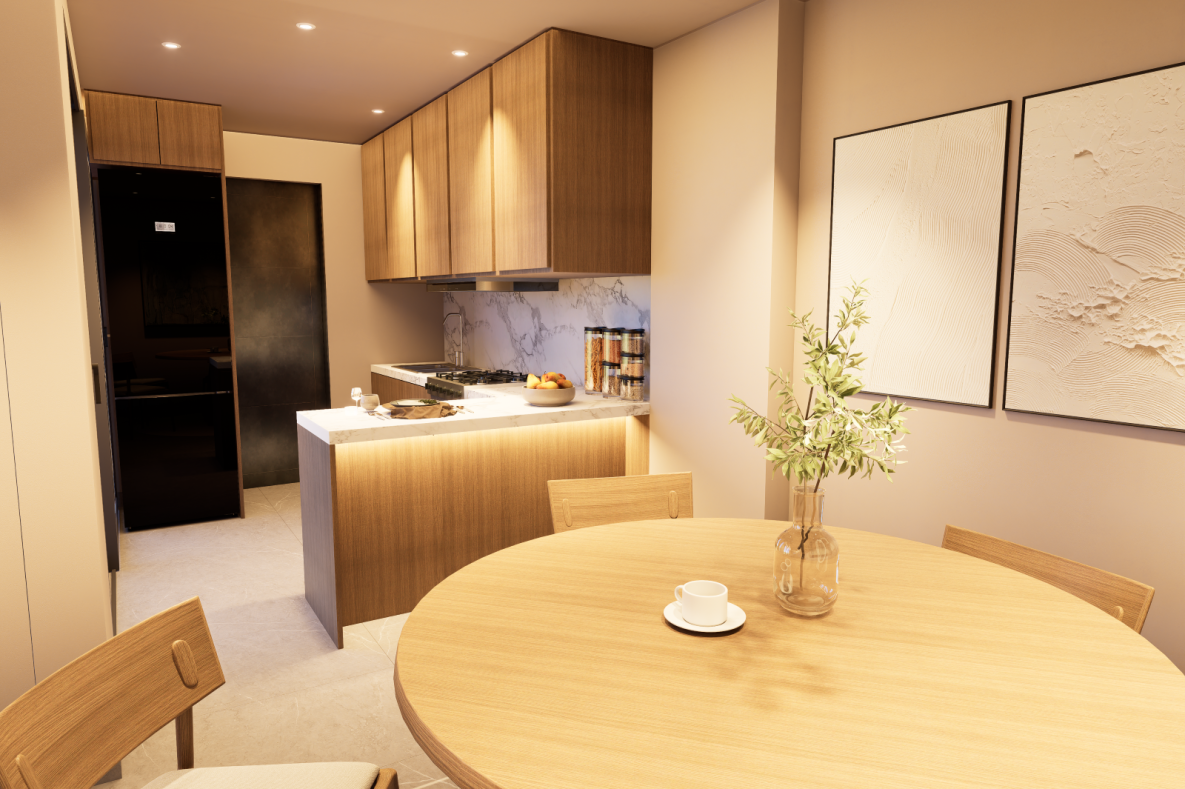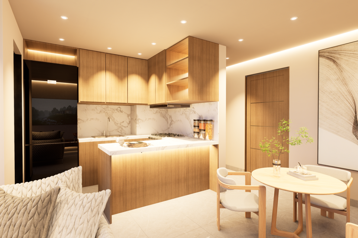 Acabados premium: porcelanatos, madera spc, piedra sinterizada en cocina.