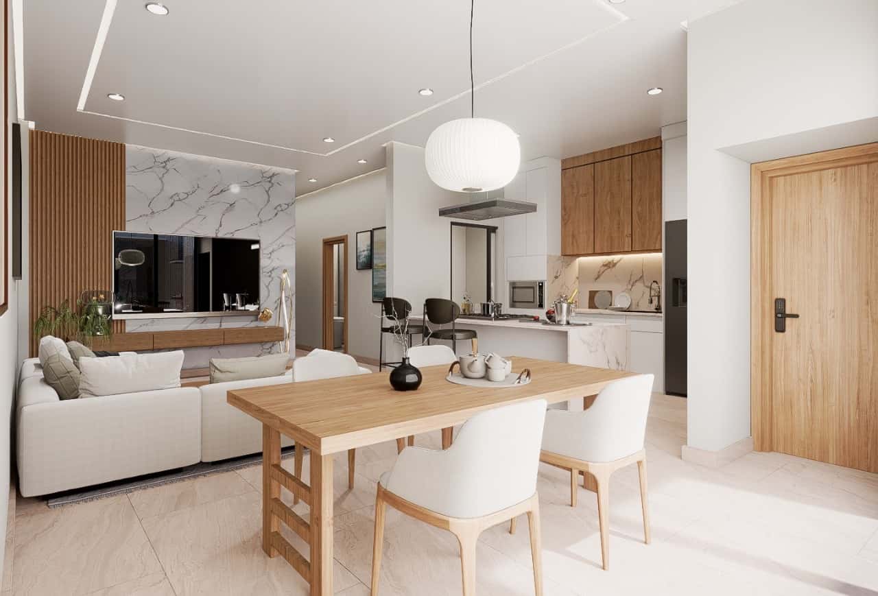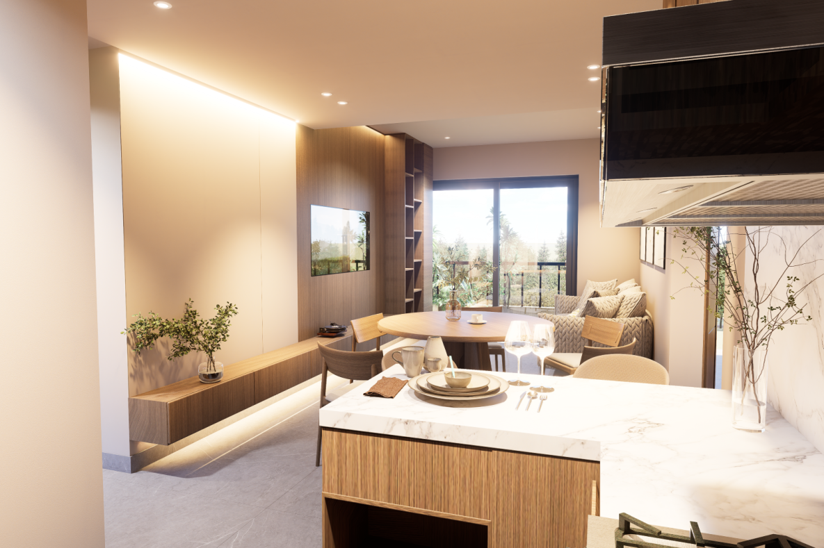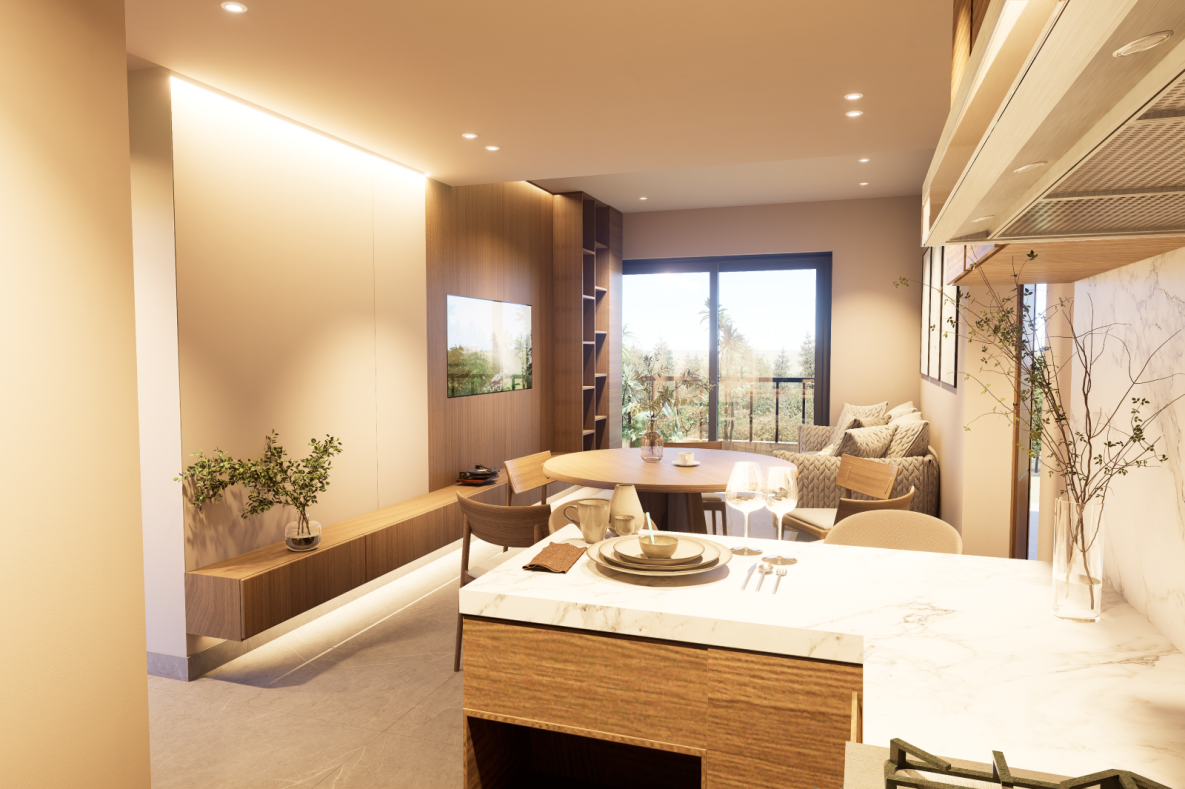 Acabados premium: porcelanatos, madera spc, piedra sinterizada en cocina.